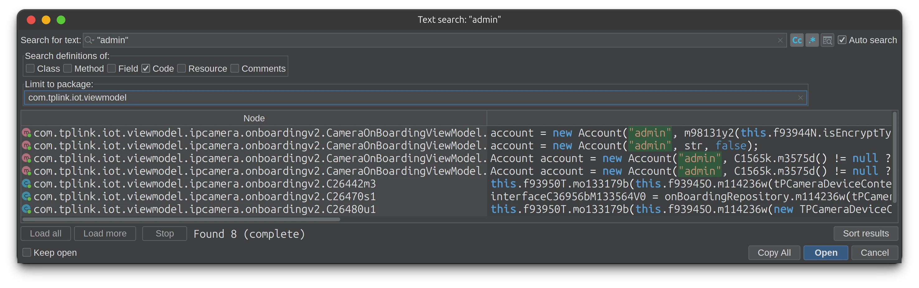 Searching for "admin" in JADX gives us many hits but there are a few concentrated in a CameraOnboardingViewModel class that look interesting: